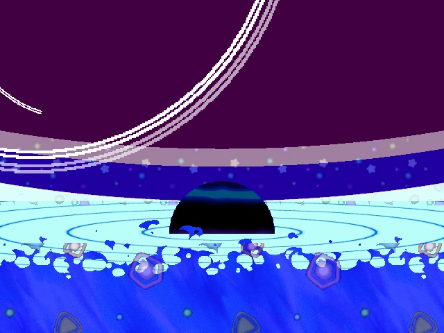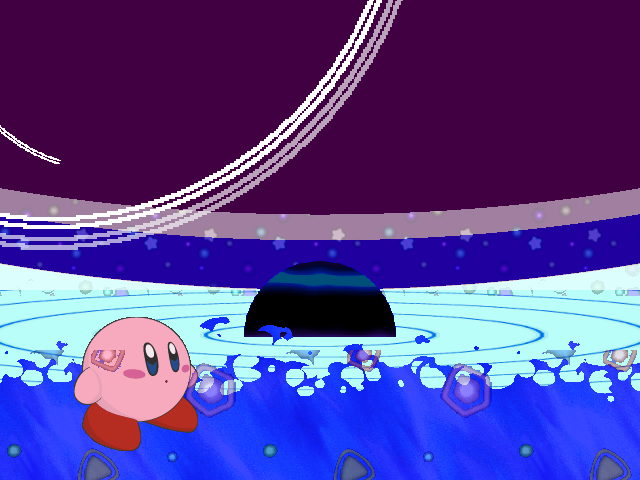 KirbyWii LastBattle is a recreation of the area where Magolor is fought, appearing to use custom-made graphics as opposed to ones ripped from Kirby's Return to Dream Land; it is far less detailed in comparison to the original, featuring large areas of solid colour and less effects in general, with those that are present being simplified and animating at varying framerates. Occupying the centre of the stage is a black orb surrounded by a series of light blue rings that extend outwards to make up the floor the combatants fight on, with some sort of blue fire effect accompanied by various stars and shapes situated on the foreground layer, as well as an array of white lines circling around the stage. The background of the stage appears slightly different between older versions of M.U.G.E.N and 1.1, with the latter displaying a partially-transparent white line separating the blue and purple segments of the background; this is due to older versions of M.U.G.E.N automatically hiding the background colour of an image if transparency is applied to the element and thus ignoring the value of the mask parameter, which in this instance was set to show the transparency colour. Although the stage is fairly tall, the camera doesn't move upwards at a fast enough rate for characters to stay onscreen during a Super Jump.