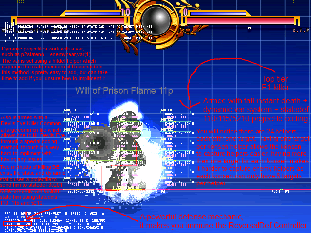 A common trait with cheapies is the ability to hit a character that lacks hurtboxes, as well as the inability to be K.O.'d via the debug keys, or through normal means for that matter. Most cheapies use the Chaos/F1 Killer method to exploit the weaknesses of another character, mostly by using the states 110, 115 and 5210 which all have HitBy controllers within them. Most cheapies, especially earlier ones, work on WinMUGEN only, due to the methods that they use.