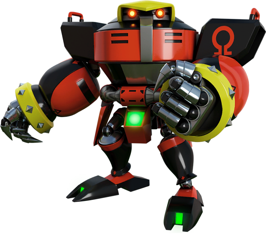 Deactivated and sealed away within an abandoned base to guard a suspended Shadow locked within his stasis pod, Omega was accidentally reactivated by Rouge while she was attempting to locate Eggman's "secret treasure". Furious at the doctor's actions and swearing revenge, he attempted to attack Shadow, due to mistaking him as another robot. After Rouge clarified that this Shadow was the original, he joined the pair as a part of Team Dark, in order to not only get his revenge on Eggman for wasting his potential, but also destroy all other robots to prove himself superior. Due to his one-track obsession with defeating Eggman, Omega is extremely reckless and aggressive, destroying anything that stands in his way - even if his orders have nothing to do with extermination.