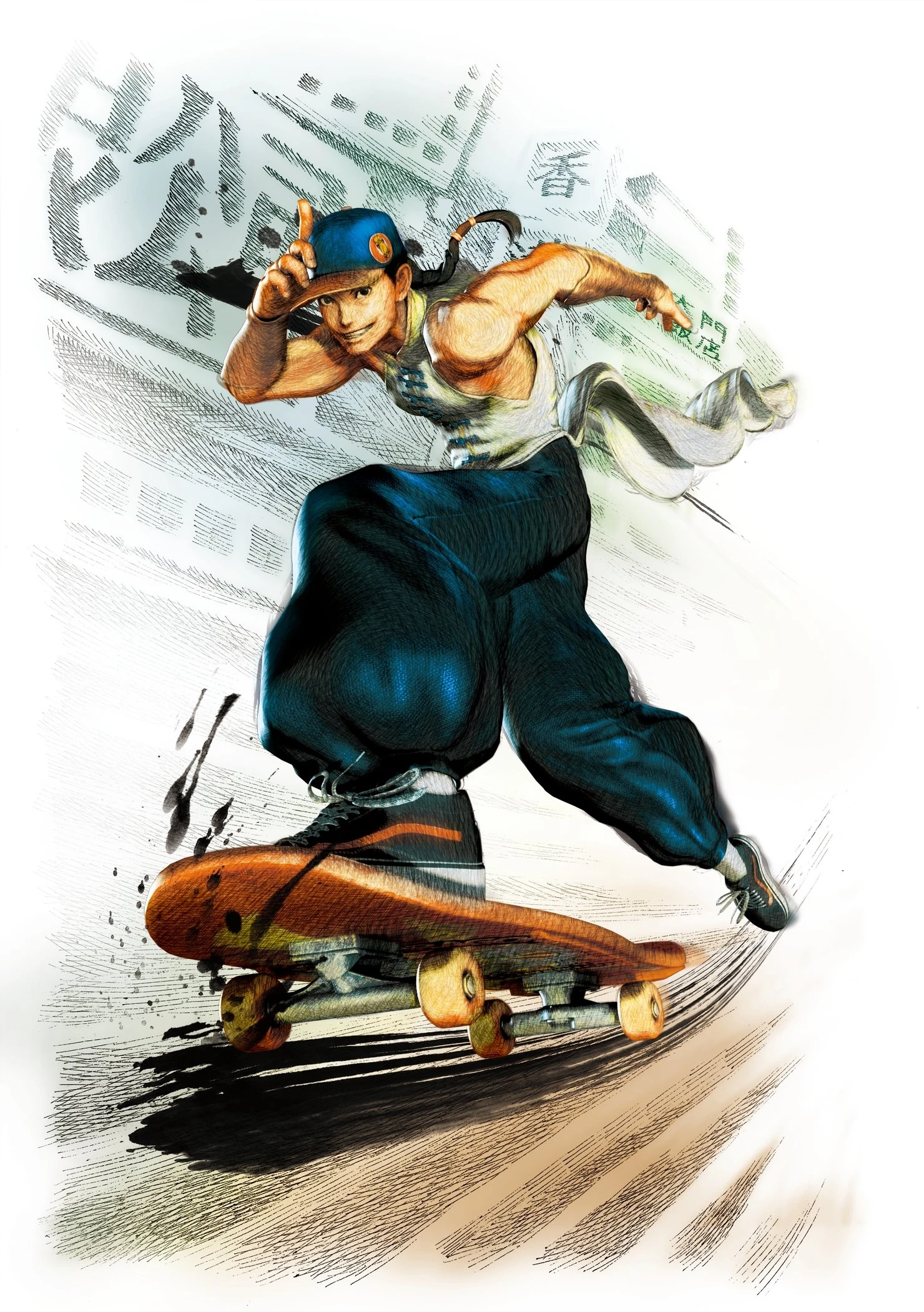 Yun is a character from the Street Fighter series, first appearing in the Street Fighter III series of games as the older twin brother of Yang. From Hong Kong, he is an energetic, extroverted skateboarder skilled in Kung Fu and wears a white changshan with a blue baseball cap.